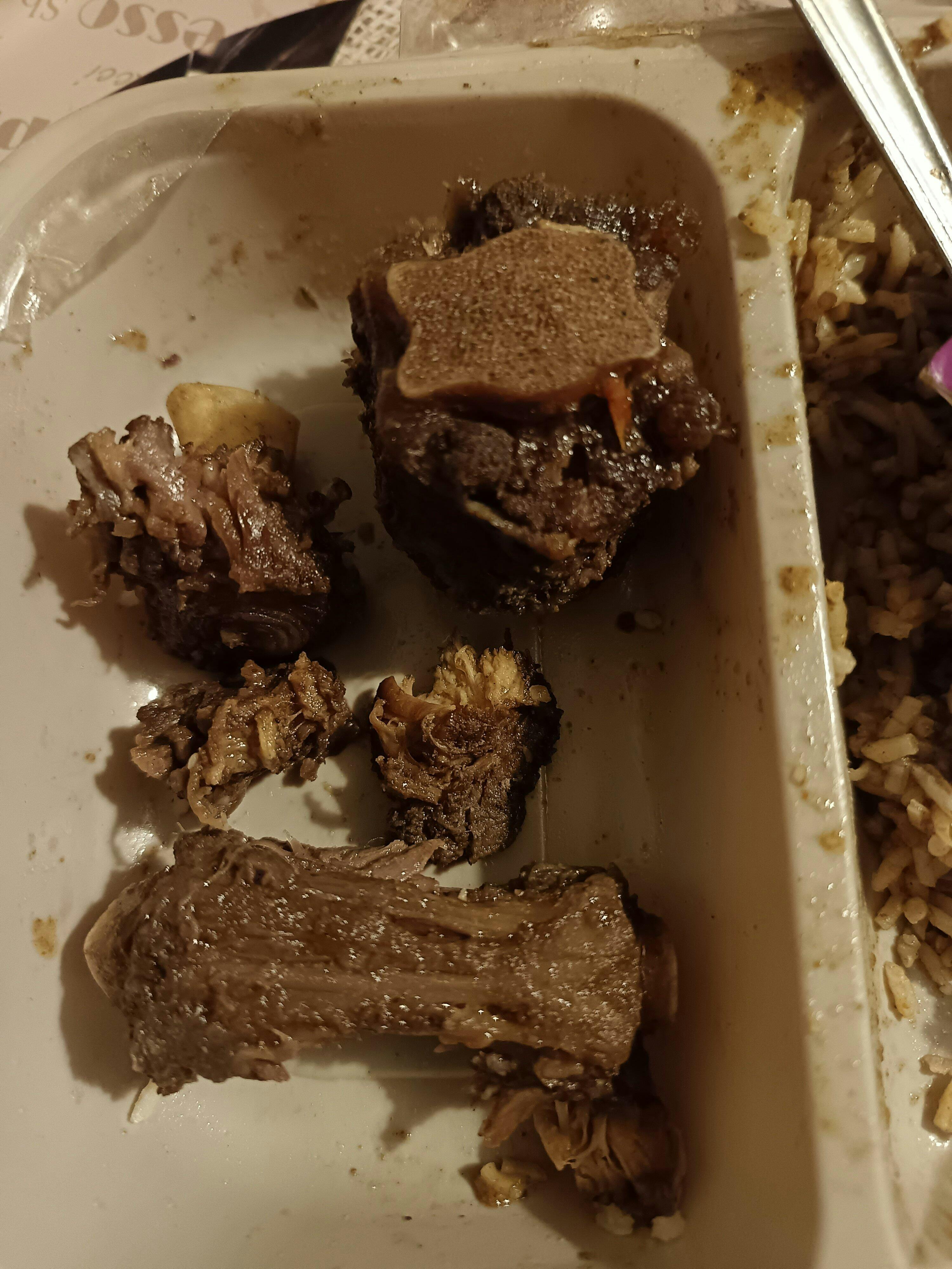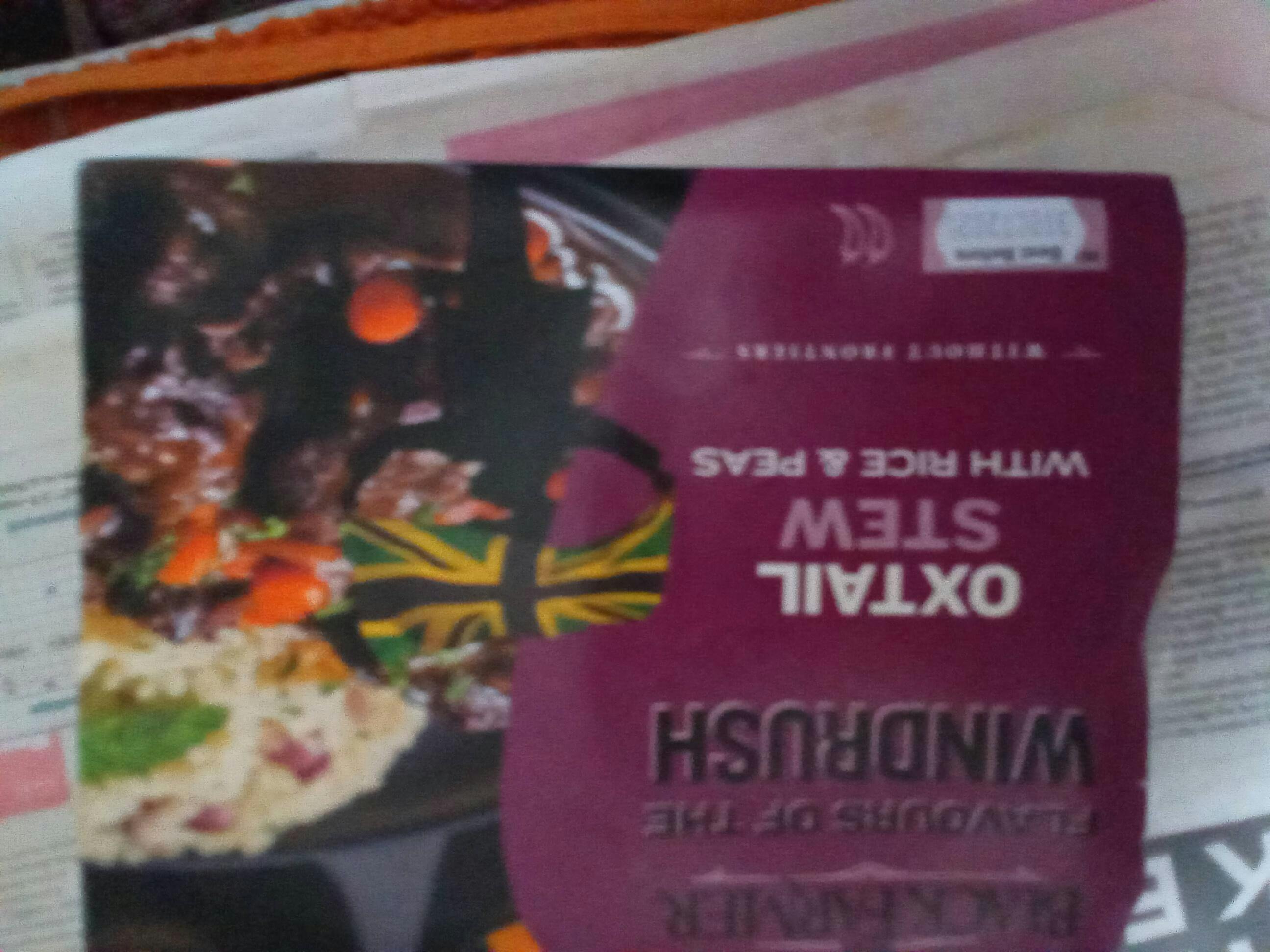 rice (38%), oxtail (15%), water, carrots, Wheat flour (with calcium, iron, niacin, thiamin), sweet peppers, red kidney beans (4%), onions, tomato, rapeseed oil, herbs & spices in variable proportions (black pepper, paprika, Mustard, flour, garlic, Celery, cumin, chilli), monosodium glutamate, browning (ammonia caramel), ginger, salt, Coconut Cream.